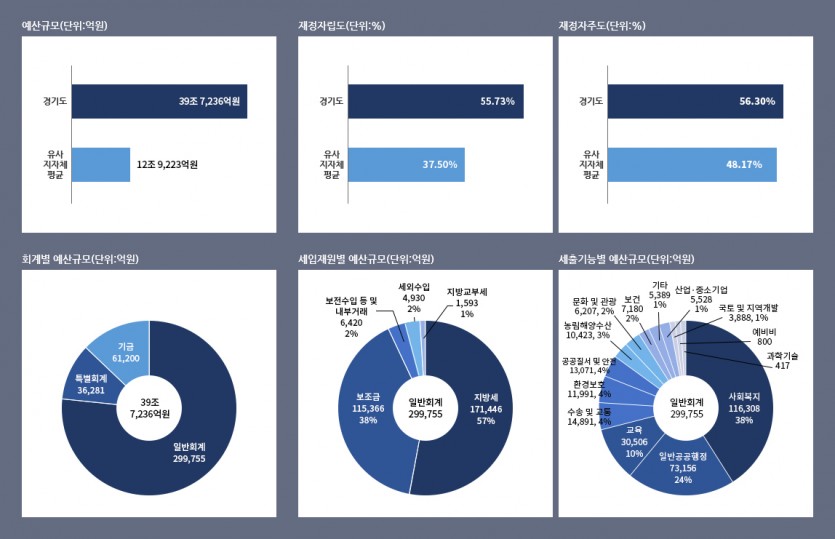 2022년 경기도 예산기준 재정공시 예산규모 경기도 39조 7,236억원 / 유사 지자체평균 12조 9,223억원 , 재정자립도 경기도 : 55.73% / 유사지자체 평균 37.50%(단위%), 재정자주도 경기도 56.30% / 유사지자체 평균 48.17%(단위%), 회계별 예산규모 총 39조 7,236억원 / 일반회계 29조 9,755억원 / 특별회계 3조 6,281억원 / 기금 6조 1,200억원, 세입재원별 예산규모 일반회계 299,755 / 지방세 171,446 (57%) / 보조금 115,366 (38%) / 보전수입 등 및 내부거래 6,420 (2%) / 세외수입 4,930(2%) / 지방교부세 1,593(1%)(단위:억원), 세출기능별 예산규모 일반회계 ,억원 / 299,755 / 사회복지 116,308(38%) / 일반공공행정 73,156(24%) / 교육 30,506(10%) / 공공질서 안전 13,071(4%) / 환경보호 11,991(4%) / 수송.교통 14,891(4%) / 문화관광 6,207 (2%) / 농림해양수산 10,423(3%) , 보건 7,180(2%) / 국토지역개발 3,888(1%) / 기타 5,389(2%) / 산업중소기업 5,528(1%)(단위:억원) / 과학기술 417 / 예비비 800/