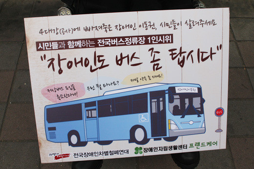 10년 전 서울 숙대입구역에서 한 장애인이 1인 시위했던 저상버스 도입 관련 플래카드. ⓒ에이블뉴스 DB 에이블포토로 보기▲ 10년 전 서울 숙대입구역에서 한 장애인이 1인 시위했던 저상버스 도입 관련 플래카드. ⓒ에이블뉴스 DB