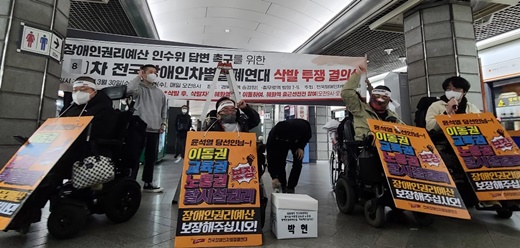 또한 박 상임공동대표는 “우리는 인수위에 요구한 예산을 한 푼도 깎지 말고 받아들이라는 것이 아니라, 이 중에서 얼마나 가능한지에 대한 답을 달라는 것”이라면서 “어느 정도 가능하고, 이후 어떤 계획을 갖겠다는 답을 진심으로 촉구한다. 19일 밤까지 답을 주지 않으면 20주년을 맞이하는 장애인차별철폐의 날 오전 8시 이 자리(경복궁역)에서 지하철을 타겠다”고 경고했다.