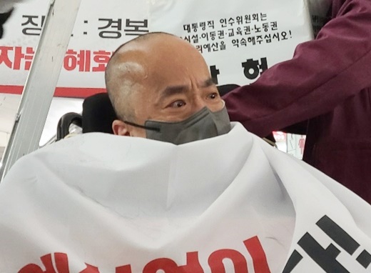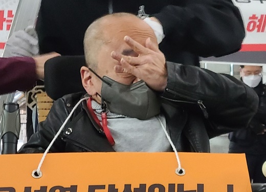 8일 오전 8시, 서울 3호선 경복궁역 승강장(7-1)에서 장애인권리예산에 대한 인수위 답변을 촉구하며 전국장애인차별철폐연대(전장연) 삭발 투쟁에 나선 한국장애인자립생활센터협의회 박현 조직실장이 삭발을 마친 후, 흐르는 눈물을 닦고 있다.ⓒ에이블뉴스 에이블포토로 보기▲ 8일 오전 8시, 서울 3호선 경복궁역 승강장(7-1)에서 장애인권리예산에 대한 인수위 답변을 촉구하며 전국장애인차별철폐연대(전장연) 삭발 투쟁에 나선 한국장애인자립생활센터협의회 박현 조직실장이 삭발을 마친 후, 흐르는 눈물을 닦고 있다.ⓒ에이블뉴스
