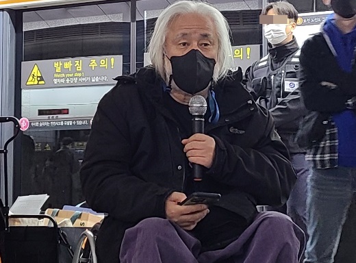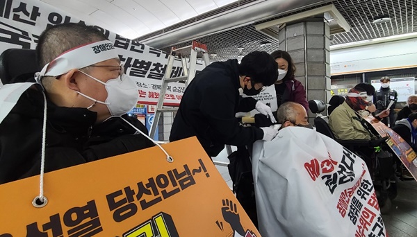 8일 오전 8시, 서울 3호선 경복궁역 승강장(7-1)에서 장애인권리예산에 대한 인수위 답변을 촉구하며 전국장애인차별철폐연대(전장연) 삭발 투쟁에 나선 한국장애인자립생활센터협의회 박현 조직실장은 벌써 오늘로 3번째 머리를 밀었다.
