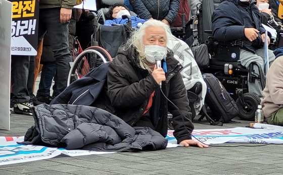 전장연 박경석 상임공동대표는 “오늘도 여기까지 오는데 지하철에서 시민들에게 온갖 혐오 발언을 들었다. 욕도 먹겠다. 장애인 이동권을 21년을 외치고 싸워왔다. 이게 어찌 대통령과 서울시장만의 몫이겠는가. 누가 대통령을 뽑고 서울시장을 뽑는가. 이제 시민들도 대답을 해야 한다”고 외쳤다.