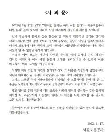 17일 서울교통공사가 ‘사회적 약자와의 여론전 맞서기: 전국장애인차별철폐연대 지하철 시위를 사례로’ 문건 논란에 발표한 사과문. ⓒ전국장애인차별철폐연대 에이블포토로 보기▲ 17일 서울교통공사가 ‘사회적 약자와의 여론전 맞서기: 전국장애인차별철폐연대 지하철 시위를 사례로’ 문건 논란에 발표한 사과문. ⓒ전국장애인차별철폐연대