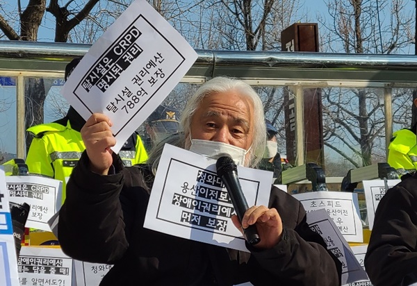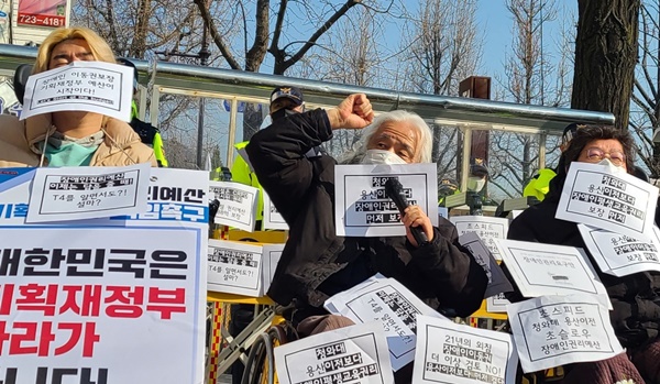 22일 전국장애인차별철폐연대가 서울 종로구 인수위원회 인근에서 기자회견을 열고, 장애인권리예산 총 6224억원을 요구하고 있다.ⓒ에이블뉴스 에이블포토로 보기▲ 22일 전국장애인차별철폐연대가 서울 종로구 인수위원회 인근에서 기자회견을 열고, 장애인권리예산 총 6224억원을 요구하고 있다.ⓒ에이블뉴스