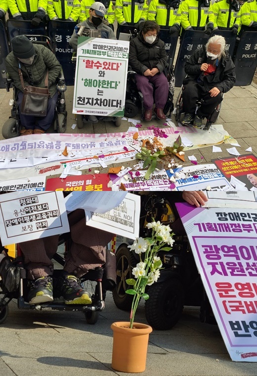 지난 14일 서울 종로구에 있는 윤석열 대통령 당선인의 첫 인수위원회 출근 날에도 전국장애인차별철폐연대(전장연)는 왔습니다. 당선인은커녕, 담당자 하나 나오지 않은 채 이들을 맞은 건 이제는 너무나 친숙한 경찰들뿐이었습니다. 20분째 경찰에게 제지당하자, 6만원 짜리의 난 화분을 내동댕이쳤습니다. 자료도 북북 찢어버렸습니다.