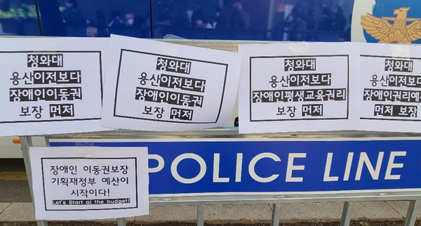 인수위앞 폴리스라인에 붙여진 장애인권리예산 요구안 내용.ⓒ에이블뉴스 에이블포토로 보기▲ 인수위앞 폴리스라인에 붙여진 장애인권리예산 요구안 내용.ⓒ에이블뉴스