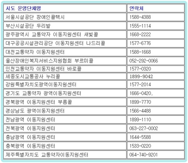전국의 장애인콜택시 각시도 명칭과 연락처를 도표로 만들었음에도 다시 한 번 풀어씀은 시각장애인을 위해서다. 아직 시각장애인은 그림도표는 잘 읽을 수 없으므로.