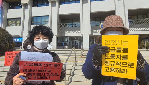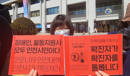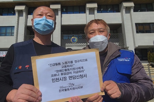 이날 지원사노조는 인천시에 ▲긴급돌봄 노동자 정규직 채용 ▲코로나로 일이 끊기는 활동지원에게 휴업급여 등 생계대책 마련 등을 요구하며, 박남춘 시장과의 면담을 요청했다.