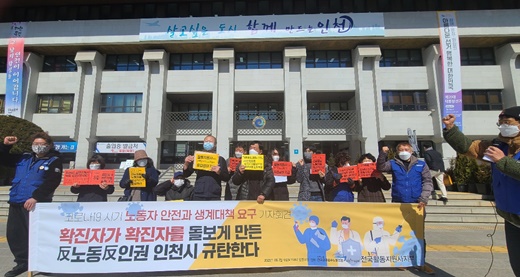 민주노총 공공운수노조 의료연대본부 전국활동지원사지부(이하 지원사노조)는 2일 인천시청 앞에서 기자회견을 갖고, 코로나19 시기 장애인활동지원사의 안전과 생계대책을 요구했다.