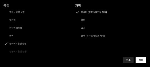 넷플릭스는 음성과 자막을 다양하게 선택 할 수 있다. ⓒ넷플릭스 에이블포토로 보기▲ 넷플릭스는 음성과 자막을 다양하게 선택 할 수 있다. ⓒ넷플릭스