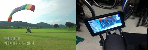 동력 패러글라이딩 체험 장면(사진 왼쪽)과 휠체어 손잡이에 후방카메라를 설치한 모습(오른쪽). ⓒ그린라이트 에이블포토로 보기▲ 동력 패러글라이딩 체험 장면(사진 왼쪽)과 휠체어 손잡이에 후방카메라를 설치한 모습(오른쪽). ⓒ그린라이트