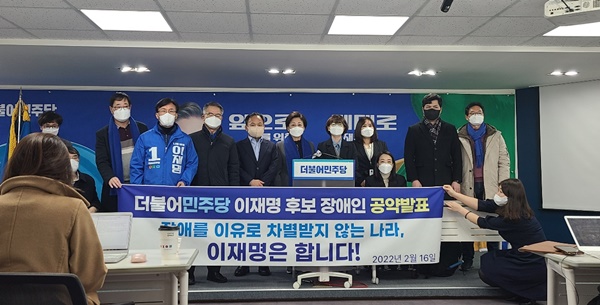 이재명 더불어민주당 대통령 후보 선대위는 16일 더불어민주당 당사에서 이 같은 내용이 담긴 ‘장애인의 권리를 동등하게 보장하고 장애를 이유로 차별받지 않는 나라’를 위한 장애인 공약을 발표했다.ⓒ에이블뉴스 에이블포토로 보기▲ 이재명 더불어민주당 대통령 후보 선대위는 16일 더불어민주당 당사에서 이 같은 내용이 담긴 ‘장애인의 권리를 동등하게 보장하고 장애를 이유로 차별받지 않는 나라’를 위한 장애인 공약을 발표했다.ⓒ에이블뉴스