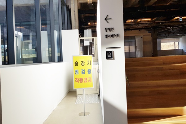 한국승강기안전공단으로부터 안전검사를 받지 않아 운행을 중지한 수원시 장안구 복합문화공간인 ‘111CM(일일일커뮤니티)’ 내부 수직형리프트. ⓒ박종태 에이블포토로 보기▲ 한국승강기안전공단으로부터 안전검사를 받지 않아 운행을 중지한 수원시 장안구 복합문화공간인 ‘111CM(일일일커뮤니티)’ 내부 수직형리프트. ⓒ박종태