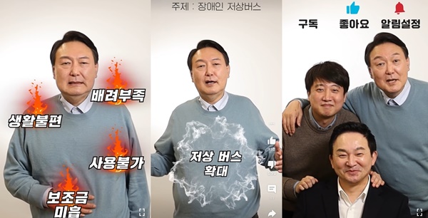 이에 정책해결로 “하루빨리 시외버스와 고속버스를 저상버스나 리프트 장착버스로 보급하자”고 밝혔다. 이후 마지막에 윤석열 후보가 등장해 아랫배를 쓸어내리다가 ‘저상버스 확대’ 문구와 함께 해소된 포즈를 취하는 ‘소화제 광고’를 패러디하며 마쳤다.