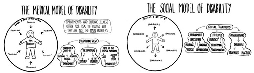 그런데 우리나라의 장애인복지법 제2조 1항엔 “장애인이란 신체적ㆍ정신적 장애로 오랫동안 일상생활이나 사회생활에서 상당한 제약을 받는 자”로 정의되어 있다. 상호작용이란 언급은 없으며 일상생활이나 사회생활에 상당한 제약을 받는 이유는 신체적, 정신적 손상이란 것이다. 결국, 장애란 개인의 탓이요, 의료적 정의에 머무르는 것이다. 장애에 대한 의료적 모델에 기반하고 있음은 물론이다.
