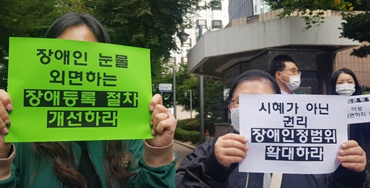 ‘장애인 눈물 외면하는 장애등록 절차 개선하라’ 피켓을 든 모습. ⓒ에이블뉴스DB 에이블포토로 보기▲ ‘장애인 눈물 외면하는 장애등록 절차 개선하라’ 피켓을 든 모습. ⓒ에이블뉴스DB