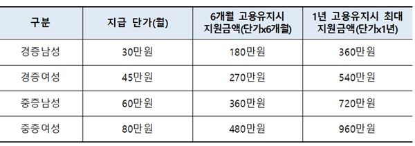 6개월 고용유지 후 신청시 6개월에 해당하는 금액(180~480만원)을 지급하며, 1년 고용유지 후 신청 시 1년에 해당하는 금액(360~960만원)을 지급한다. 다만, 장애인 근로자의 월 임금(최저임금에 산입되는 임금)의 60%가 월 지원 단가보다 적다면 더 적은 금액을 기준으로 지원한다.