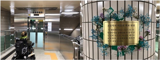 장애인 휠체어리프트 추락사망 사고가 발생한 1·5호선 신길역 환승구간에 설치해 2020년 2월 28일부터 운행을 시작한 경사형 엘리베이터(승강기)를 장애인 당사자가 이용하는 모습(좌측), 2020년 2월 28일 엘리베이터 완공을 기념하며 설치한 고 한경덕 씨의 추모동판(우측). ⓒ에이블뉴스DB 에이블포토로 보기▲ 장애인 휠체어리프트 추락사망 사고가 발생한 1·5호선 신길역 환승구간에 설치해 2020년 2월 28일부터 운행을 시작한 경사형 엘리베이터(승강기)를 장애인 당사자가 이용하는 모습(좌측), 2020년 2월 28일 엘리베이터 완공을 기념하며 설치한 고 한경덕 씨의 추모동판(우측).