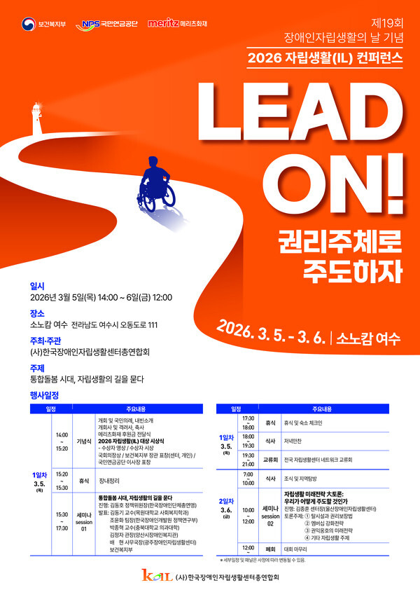 정원탁 기자 : 한국장애인자립생활센터총연합회(이하 한자연, 상임대표 진형식)는 ‘장애인 자립생활의 날’을 기념해 오는 3월 5일부터 6일까지 여수 소노캄 호텔 그랜드볼룸에서 ‘2026 자립생활(IL) 컨퍼런스’를 개최한다.