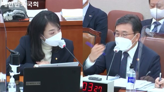 에이블포토로 보기▲ 국회 보건복지위원회 최혜영 의원(왼쪽)과 보건복지부 권덕철 장관(오른쪽). ⓒ국회방송 캡쳐
