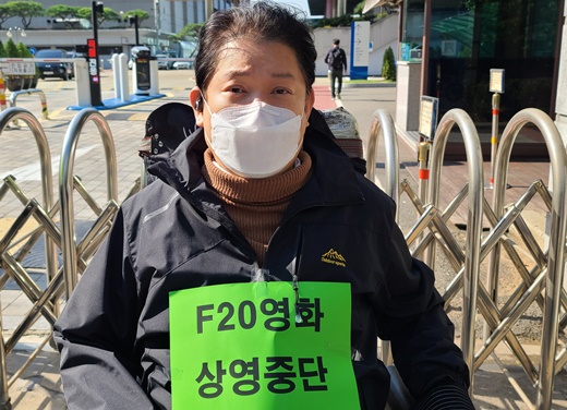 ‘F20 영화 상영중단’ 피켓을 붙인 한국장애인자립생활협의회 최용기 회장.ⓒ전국장애인차별철폐연대 에이블포토로 보기▲ ‘F20 영화 상영중단’ 피켓을 붙인 한국장애인자립생활협의회 최용기 회장.ⓒ전국장애인차별철폐연대
