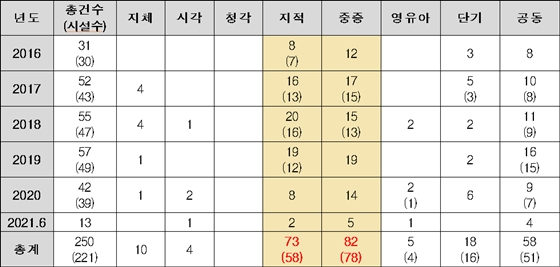 이중 보조금관리법 위반은 250건, 사회복지사업법 및 장애인복지법 위반은 392건이며, 시설 유형별로는 중증장애인시설, 지적장애인시설이 절반 이상을 차지한다.
