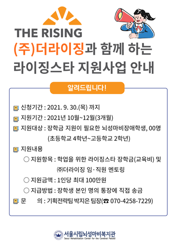 서울시립뇌성마비복지관(관장 류영수, 이하 복지관)이 오는 30일까지 신규 장학금 지원이 필요한 뇌성마비 장애학생을 대상으로 ‘(주)더라이징과 함께 하는 라이징스타 지원사업’ 대상자를 모집한다.