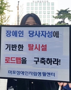 정부를 향해 ‘장애인 당사자성에 기반한 탈시설 로드맵 구축하라’고 요구하고 있는 모습. ⓒ에이블뉴스 에이블포토로 보기▲ 정부를 향해 ‘장애인 당사자성에 기반한 탈시설 로드맵 구축하라’고 요구하고 있는 모습. ⓒ에이블뉴스