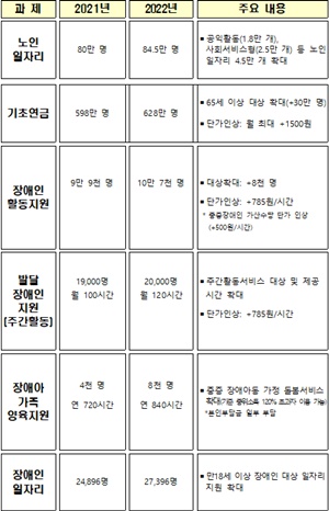 이 밖에도 독거노인·중증장애인 응급안전안심서비스 20만 명에서 30만 명으로 확대, AI·IoT 장비를 활용한 디지털 돌봄시설 지원 215개소에서 357개소로 확대, 영유아 발달장애 정밀검사비 지원대상 건강보험료 부과금액 하위 50% 이하에서 70% 이하로 확대 등을 위한 예산도 포함돼 있다.
