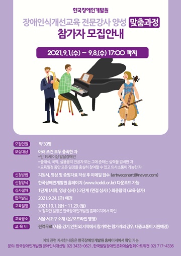 서류, 영상, 면접을 거쳐 선발하게되는 참가자들은 10월부터 11월까지 두달간 총 40시간의 교육과정(실기 레슨 및 장애인식개선 강의를 위한 이론교육) 등 표준화된 장애인식개선교육 내용의 기본에서부터 강의 기술까지 다양한 강사양성 과정 교육프로그램에 참여한다.