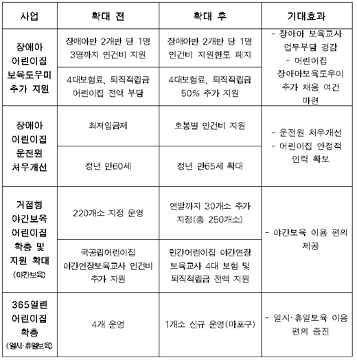 주요 내용은 ▲‘장애아전문어린이집’ 보육도우미 지원 확대 ▲‘장애아전문어린이집’ 운전원 처우개선 ▲‘거점형 야간보육어린이집’ 확충 및 보육교사 지원 확대 ▲‘365열린어린이집’ 확충이다.