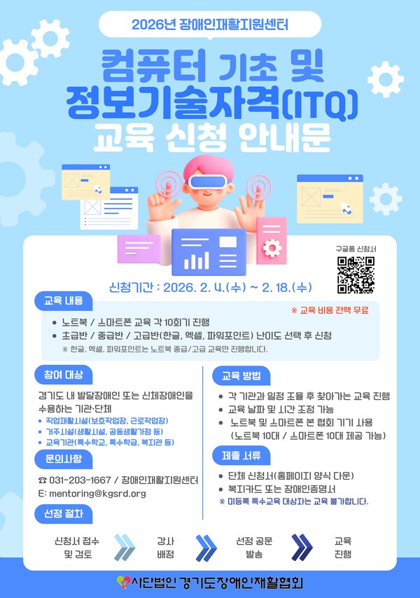 【에이블뉴스 이슬기 기자】경기도장애인재활협회 장애인재활지원센터가 2026년 ‘컴퓨터 기초 및 정보기술자격(ITQ) 교육’에 참여할 기관·단체를 오는 18일까지 모집한다.