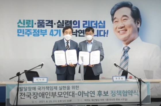 이낙연 더불어민주당 대선 경선 예비후보는 25일 서울 여의도 후보 사무실에서 전국장애인부모연대와 ‘발달장애 국가책임제 실현을 위한’ 정책협약을 체결했다. ⓒ유튜브 캡쳐 에이블포토로 보기▲ 이낙연 더불어민주당 대선 경선 예비후보는 25일 서울 여의도 후보 사무실에서 전국장애인부모연대와 ‘발달장애 국가책임제 실현을 위한’ 정책협약을 체결했다. ⓒ유튜브 캡쳐