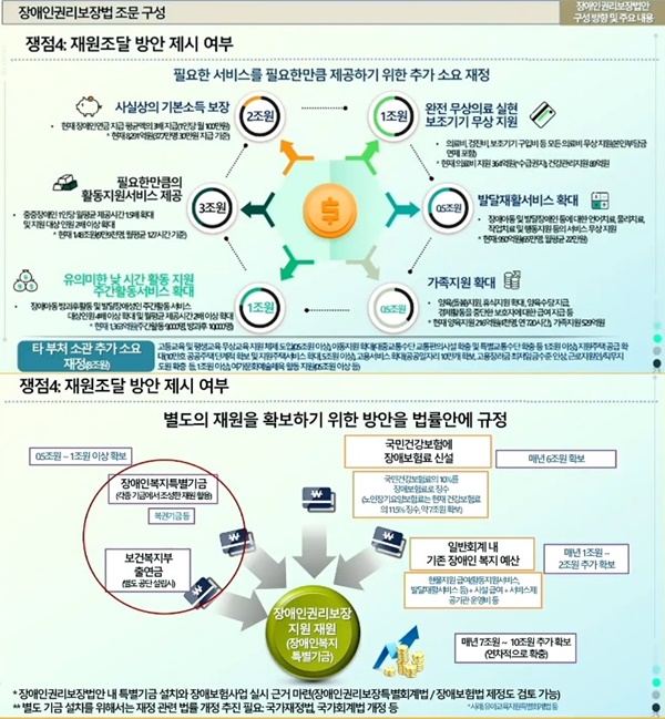 이를 실현하기 위해 복권기금 등을 통한 장애인복지특별기금, 국민건강보험에 장애보험료 신설 등 재원조달 방식을 법률에 명시하자는 것.