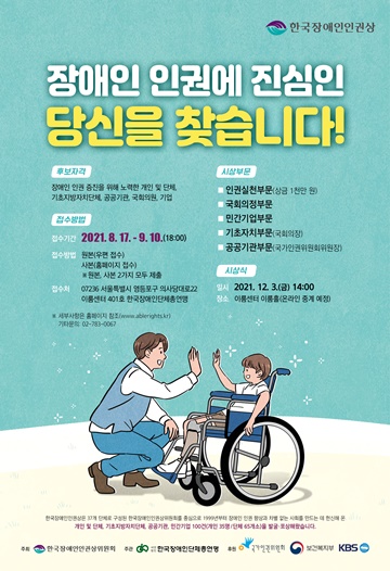 ‘한국장애인인권상’ 후보 접수에 대한 자세한 내용은 한국장애인인권상 홈페이지(www.ablerights.kr)에서 확인할 수 있다. 후보 신청 접수는 9월 10일까지 진행된다.
