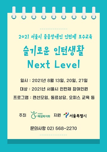 해냄복지회가 2021년 서울시 중증장애인 인턴 선발자를 대상으로 하반기 보수교육 ‘슬기로운 인턴생활, Next Level’을 진행한다. 이번 보수교육은 이달 13일, 20일, 27일에 온라인으로 실시한다.