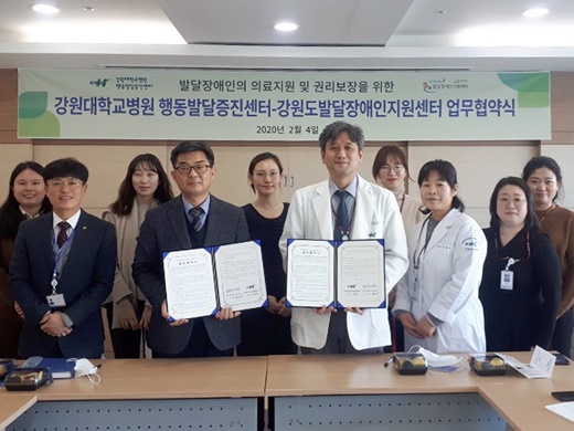작년 5월 14일 강원도장애인권익옹호기관과 강원대학교병원 발달장애인 거점병원 행동발달증진센터가 ‘발달장애인의 의료지원 및 권익옹호’를 위한 업무협약을 체결하는 모습. ⓒ강원대학교병원 행동발달증진센터, 에이블뉴스DB 에이블포토로 보기▲ 작년 5월 14일 강원도장애인권익옹호기관과 강원대학교병원 발달장애인 거점병원 행동발달증진센터가 ‘발달장애인의 의료지원 및 권익옹호’를 위한 업무협약을 체결하는 모습. ⓒ강원대학교병원 행동발달증진센터, 에이블뉴스DB