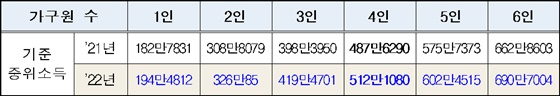 에이블포토로 보기▲ 2021년 및 2022년 기준 중위소득. ⓒ보건복지부