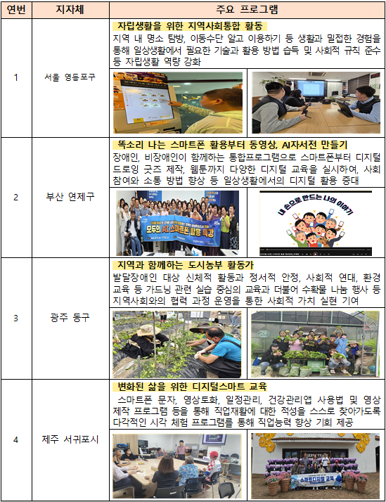 신규 지정된 지자체는 강원 고성군, 경기 연천군, 경남 거제시, 서울 광진구, 서울 구로구, 충북 영동군으로, 국고 2천만 원에서 4천1백만 원의 사업 운영비를 지원받는다. 이들 지자체는 지역 내 장애인을 위한 평생학습 기반을 마련하고, 학습자 수요를 반영한 다양한 프로그램을 운영할 예정이다.