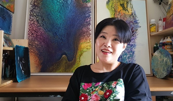 “3년째 아크릴 포어링 작업 중인데, 어떻게 표현하느냐에 따라 완전히 달라요. 소주잔을 통해 물방울을 표현하기도 하고. 나에게 핸디캡이 있지만, 자연스럽게 그에 따라 또 작품은 변하거든요. 내 손으로 작품을 완성해나갈 때 뿌듯하죠.”