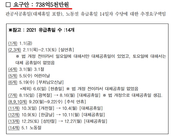 지원사노조가 국회에 전달한 추경 요구안은 총 738억 5000만원으로, 시간당 470원을 적용한 올해 유급휴일 14일 치 수당이다.