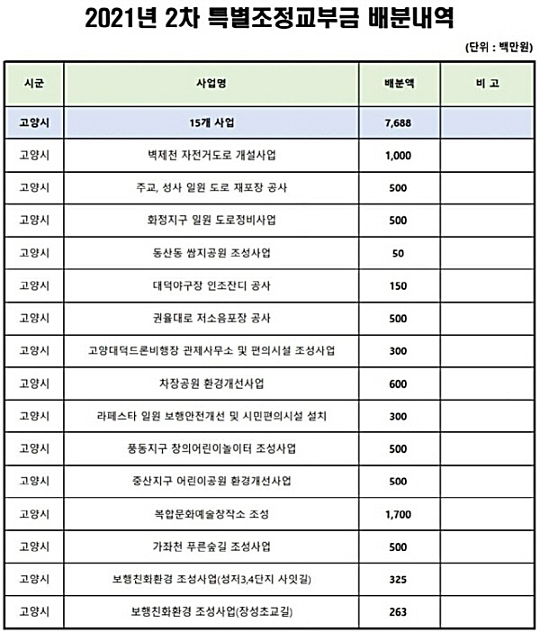 이번에 확보한 특별조정교부금은 ▲복합문화예술창작소 조성(17억) ▲공원 환경개선사업(16억) ▲벽제천 자전거 도로사업(10억원) ▲도로정비사업(18억) ▲푸른숲길 및 보행친화환경 조성(11억) 등 총 15건이다.