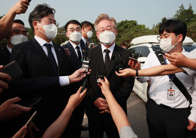 대선출마를 공식 선언한 이재명 경기지사가 1일 오전 서울 동작구 국립서울현충원에서 학도의용군 무명용사탑을 참배한 후 취재진의 질문에 답하고 있다. 공동취재사진