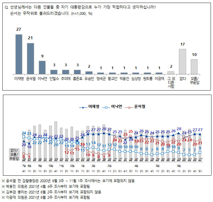 이낙연 전 더불어민주당 의원이 9%, 안철수 국민의당 대표, 홍준표 국민의힘 의원, 추미애 전 법무부 장관이 각각 3%로 뒤를 이었다. 유승민 전 국민의힘 의원은 2%, 정세균 전 국무총리와 황교안 전 미래통합당 대표는 각각 1%였다. 더불어민주당 지지층에서 이 지사가 50%, 이 전 대표가 19%였고, 국민의힘 지지층에서는 윤 전 총장이 55%, 이 지사와 홍 의원이 각각 6%였다.