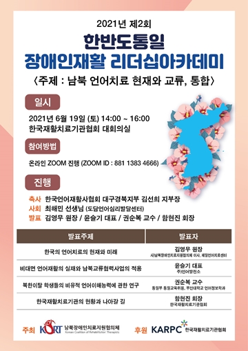 남북장애인치료지원협의체(대표 김재균)가 오는 19일 한국재활치료기관협회에서 ‘남북언어치료 현재와 교류, 통합’이라는 주제로 ‘제2회 한반도통일 장애인재활 리더십 아카데미’ 세미나를 개최한다.
