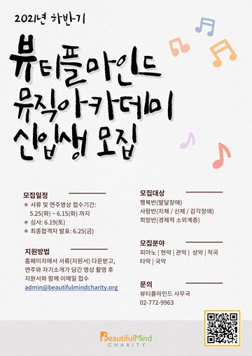 사단법인 뷰티플마인드 뮤직아카데미가 음악에 재능이 있는 장애인 및 비장애 저소득층 아동·청소년을 오는 6월 15일까지 모집한다.