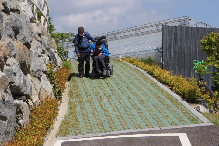 용인곤충테마파크의 가파른 길을 내려 오고 있는 휠체어 사용 장애인. ⓒ박종태 에이블포토로 보기▲ 용인곤충테마파크의 가파른 길을 내려 오고 있는 휠체어 사용 장애인. ⓒ박종태