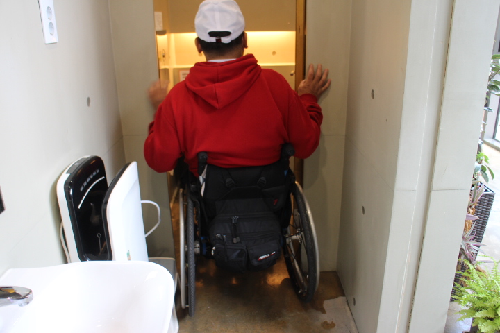 박태식 씨가 비장애인화장실에 들어갔지만 대변기가 있는 칸의 출입문이 좁아 출입을 못한다. ⓒ박종태 에이블포토로 보기▲ 박태식 씨가 비장애인화장실에 들어갔지만 대변기가 있는 칸의 출입문이 좁아 출입을 못한다. ⓒ박종태