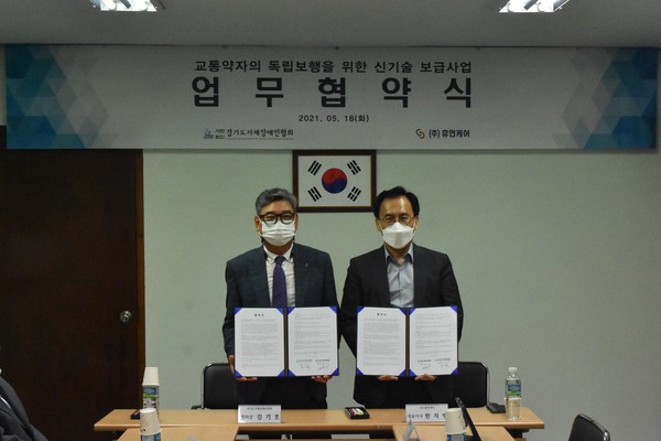 경기도지체장애인협회(협회장 김기호, 이하 경기지장협)는 주식회사 휴먼케어(대표이사 한치영, 이하 휴먼케어)와 사회공헌 및 상호 발전 방안 도모를 위한 업무협약을 체결했다.