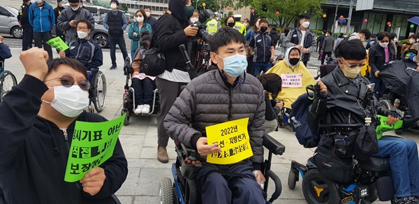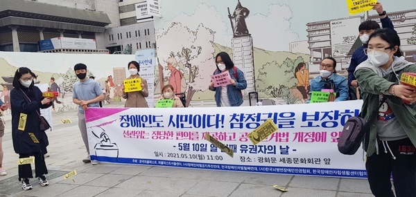 2021년 5월 10일 서울 광화문 세종대왕동상 앞에서 장애인 참정권 보장을 외치는 장애인 활동가들.ⓒ에이블뉴스 에이블포토로 보기▲ 2021년 5월 10일 서울 광화문 세종대왕동상 앞에서 장애인 참정권 보장을 외치는 장애인 활동가들.ⓒ에이블뉴스